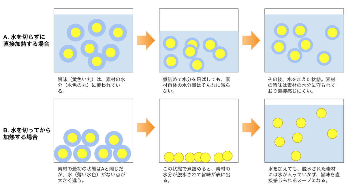 AとBではスープを飲んだ時に舌で直接感じられる旨味成分かどうかという点において大きな差が生まれていることがわかる。あくまで極端に模式化した図ではあるが、これを認識しているかどうかで料理の仕方というのもだいぶ変わってくるはず。