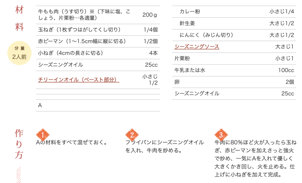 このレシピ、作り方自体にも少々分かりづらいところがある。「1. Aの材料をすべて混ぜておく。」とあるが、いや…どこまでがA?右列は3行目まで(カレー粉、針生姜、にんにく)がインデントされてるからこの3種類がAと捉えるのが一番普通だと思うが、それだとシーズニングソース、片栗粉、牛乳または水、卵、シーズニングオイルの各材料がレシピに登場しないことになってしまう。アオリの「ふわっとした卵」という文言や、手順3の「一気にAを入れて優しく大きくかき回し」というあたりから、Aが卵液であることが伺えるので、右列全体がAであると理解するのが妥当らしい。
